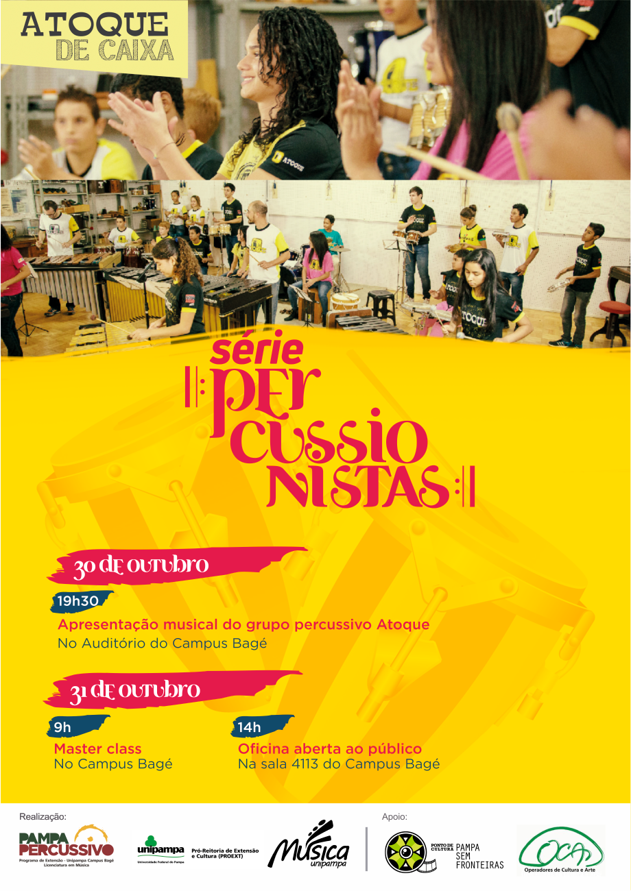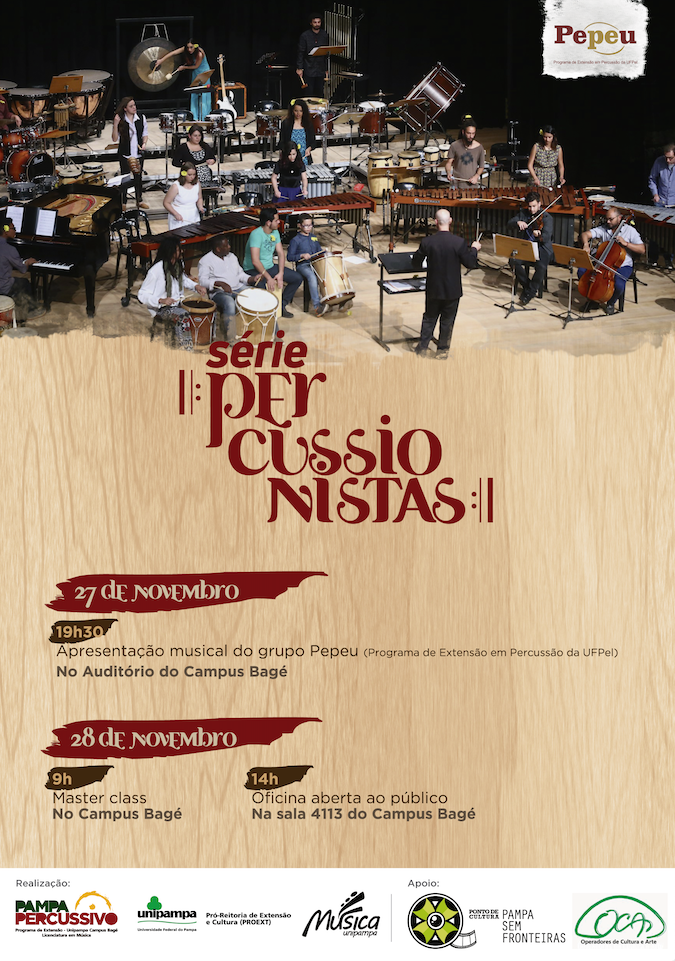 Inspirado na série de concertos “Percussionistas”, promovida pela UFRGS/Unimúsica em 2010, o projeto Série Percussionistas UNIPAMPA integra as ações do Programa de Extensão Pampa Percussivo com foco na difusão, formação e circulação da percussão no cenário local e regional.