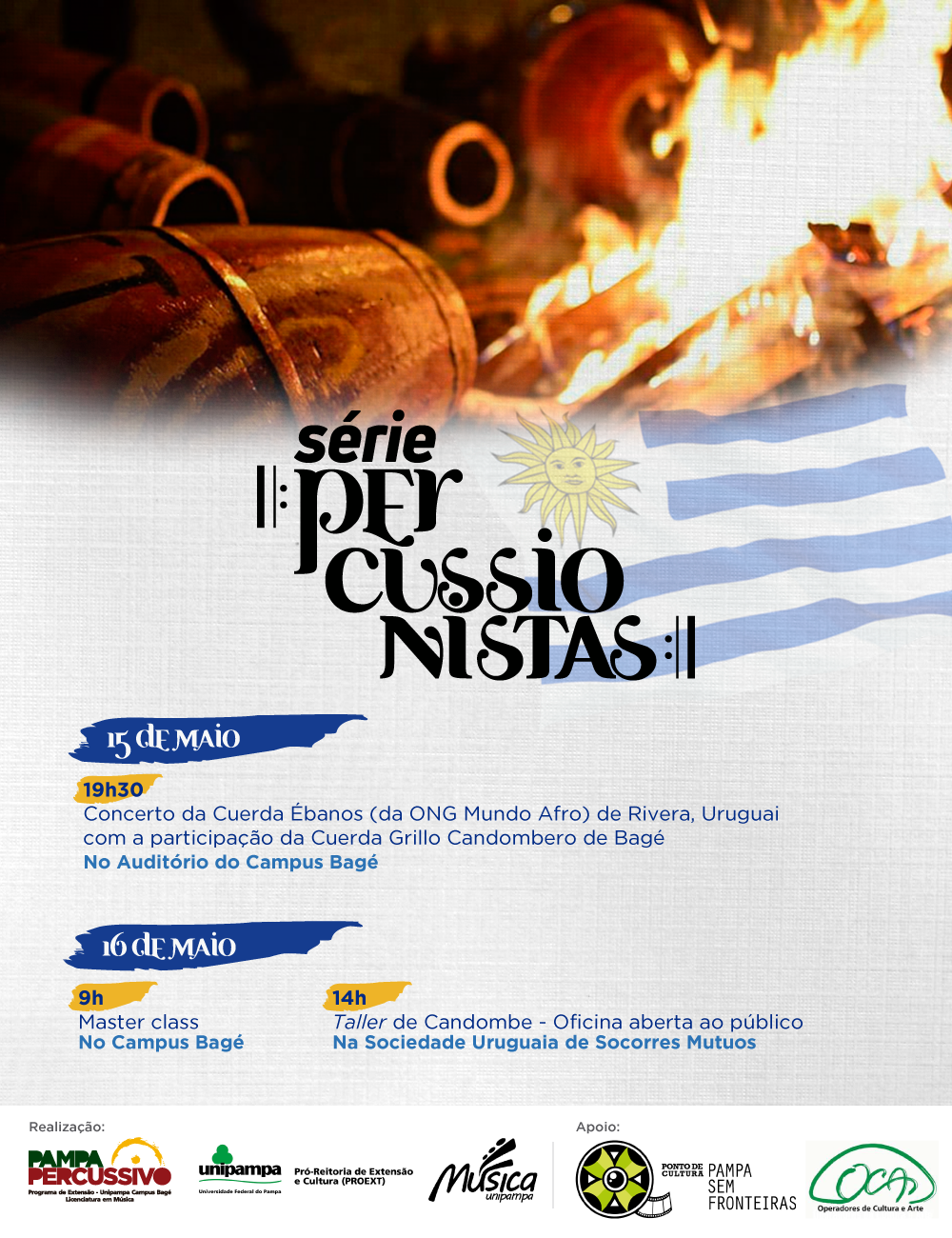 1º Concerto — Percussão Afro-Uruguaia/Candombe, com a Cuerda Ébanos (Rivera, Uruguai), realizado no Auditório do Campus Bagé no dia 15/05. A atividade foi complementada por uma masterclass de candombe no dia seguinte.